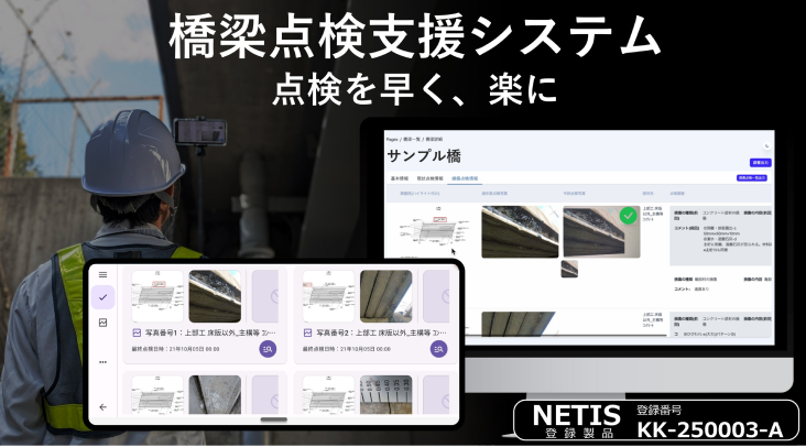 トヨタ自動車株式会社により開発された橋梁点検支援システムであり、点検業務のDXを推進するための革新的なツールです。〈NETIS登録番号:KK-250003-A〉各作業工程でのデジタル化に加え、現場での撮影忘れや撮影アングルの統一、進捗の見える化により作業ミスや手戻り削減ができます。